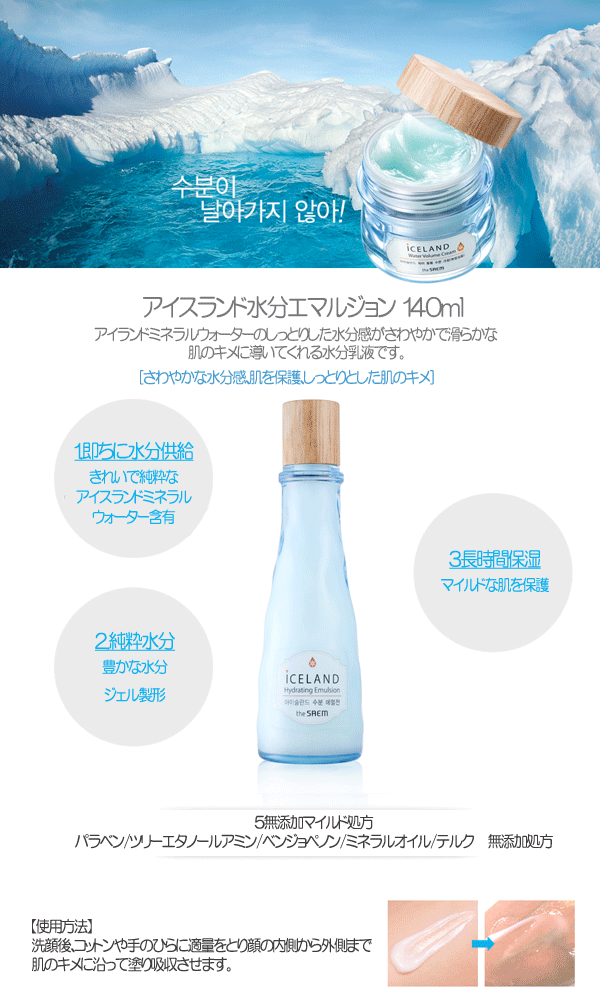 【商品名】 アイスランド水分エマルジョン 140ml 【商品説明】 アイランドミネラルウォーターのしっとりした水分感がさわやかで滑らかな肌のキメに導いてくれる水分乳液です。
