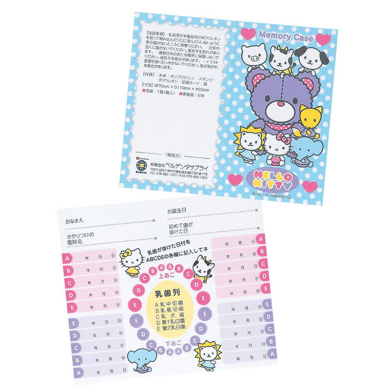 品名 ハローキティ メモリーケース 製造 日本製 材質 本体:ポリプロピレン 乳歯台:ポリウレタン 使用説明付き記録カード:紙 ■■シリーズ・関連商品■■ 乳歯保管ケース 乳歯のおうち×1個 乳歯保管ケース 乳歯のおうち×30個 乳歯ケース スマイリーケース×100個 ※商品のパッケージデザイン等は予告なく変更されることがあります。